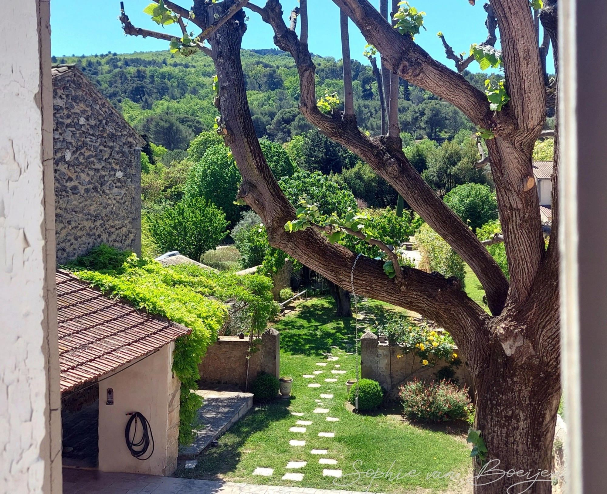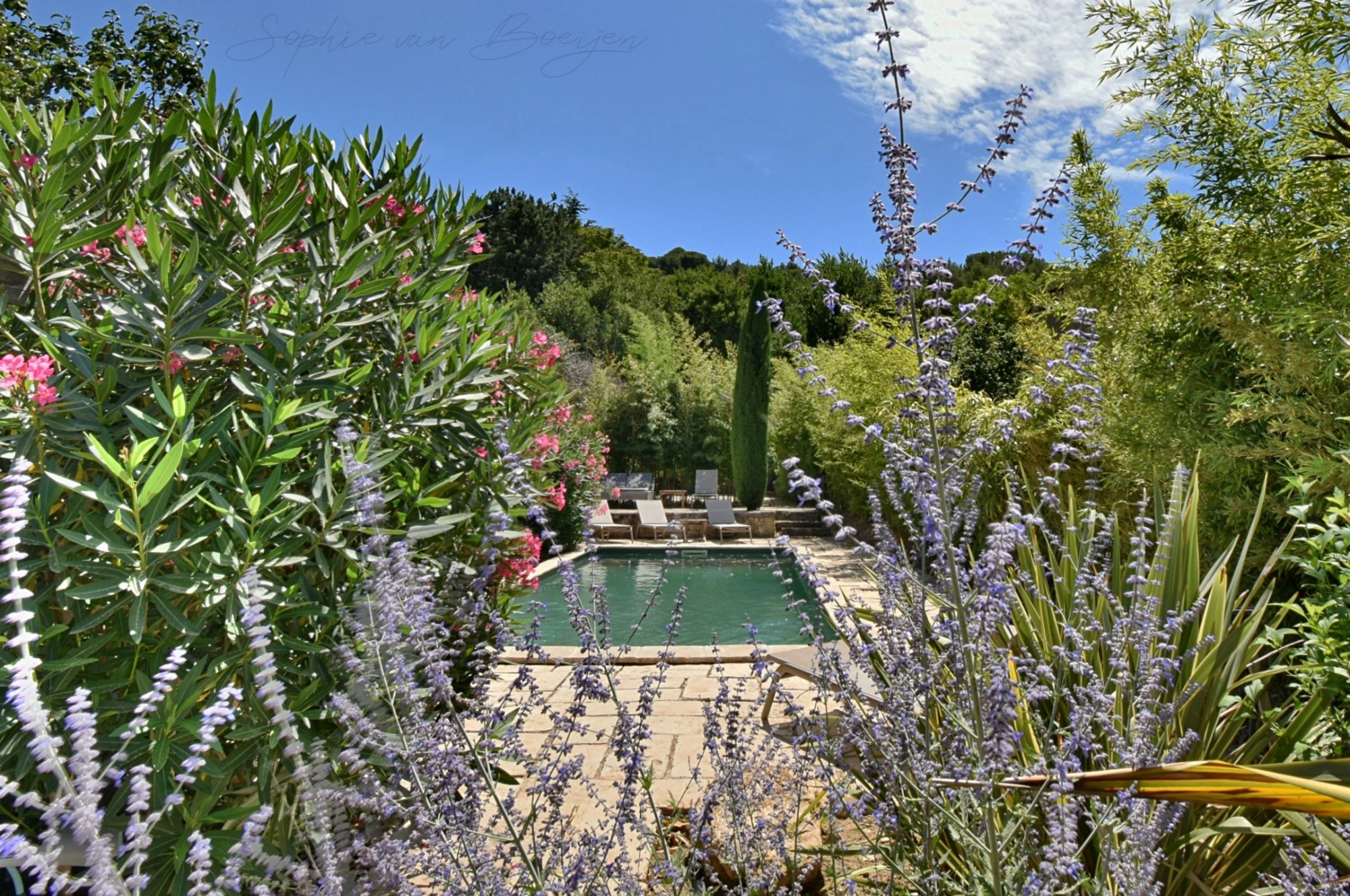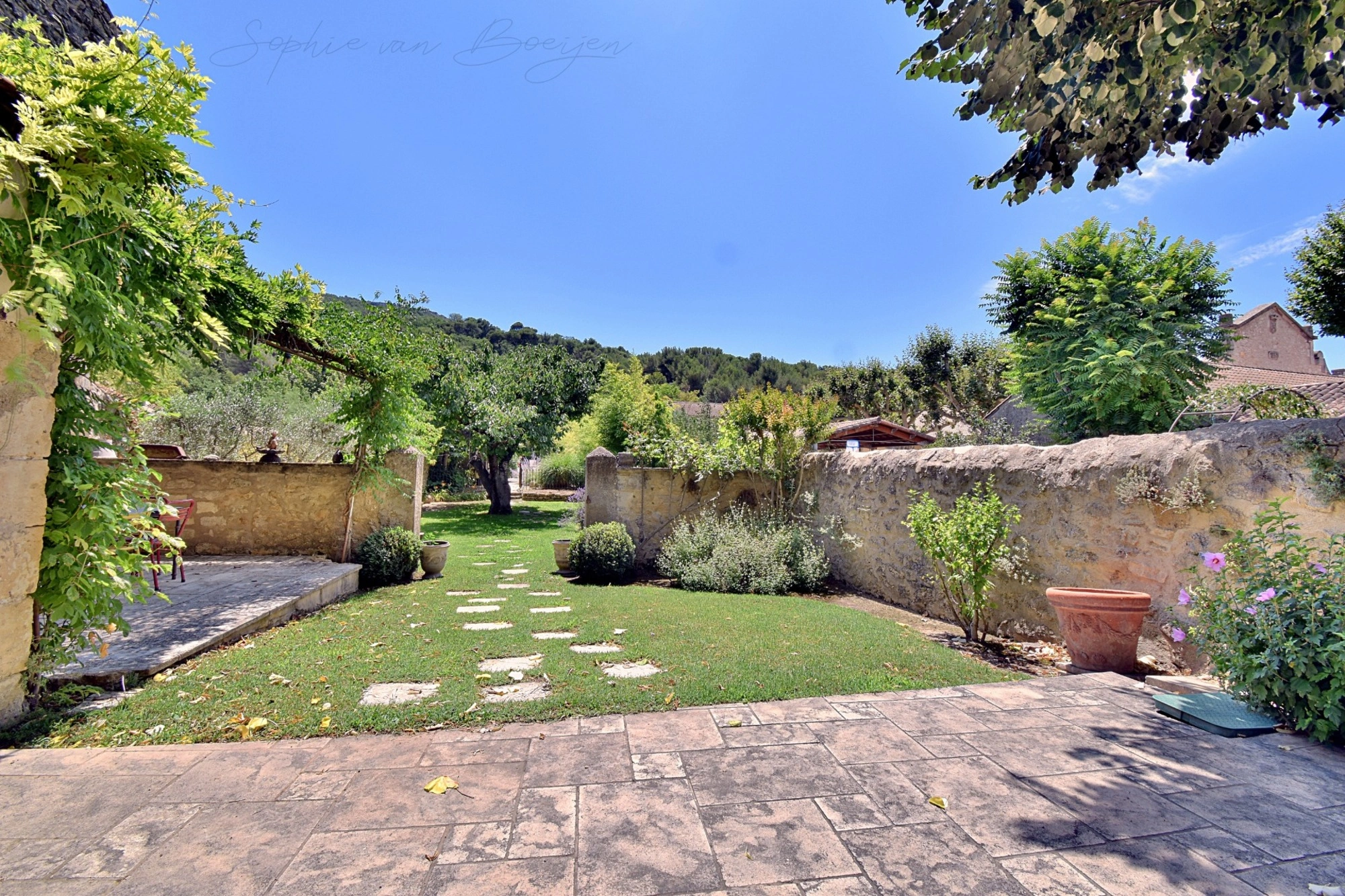 Le jardin, véritable écrin de verdure planté d'arbres fruitiers et d'essences provençales, situé en secteur « jardins remarquables », offre des espaces dédiés au gré des envies de chacun : jardin bucolique, espace piscine avec vue sur les ruines du château, boulodrome, cuisine et salon d’été, et plusieurs terrasses pour profiter tout au long de la journée et en fonction des saisons.